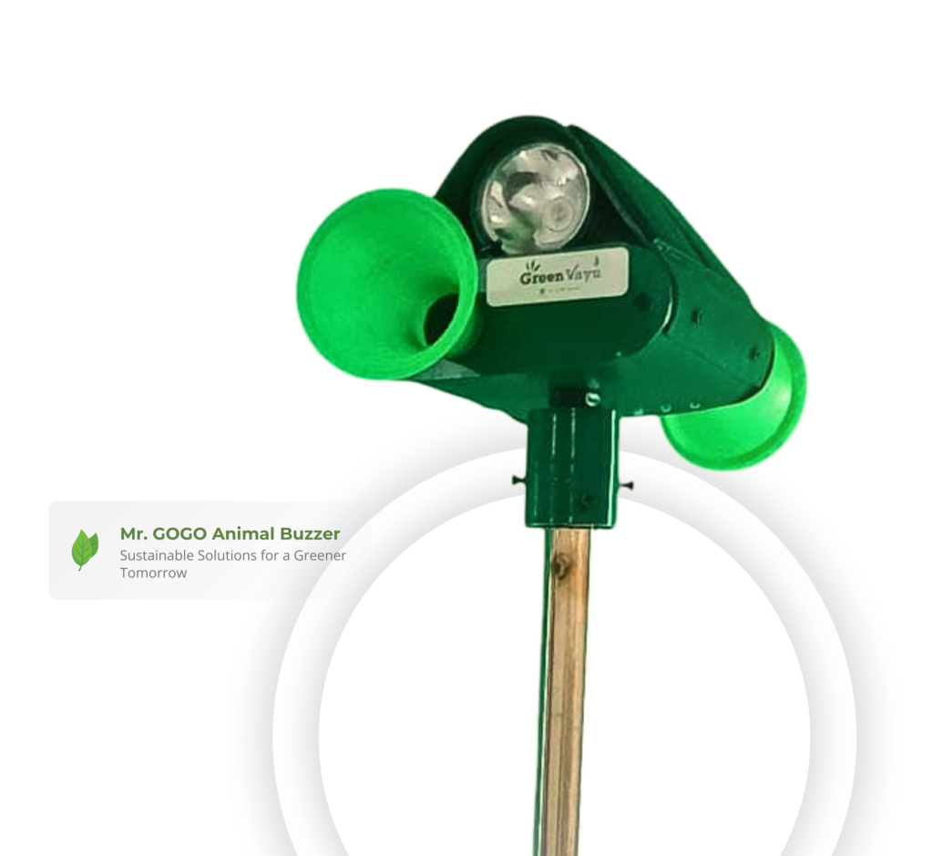 Protect your crops with GreenVayu’s Mr. Gogo! Affordable, solar-powered, eco-friendly animal and bird repellent. Easy installation and ICAR-tested.